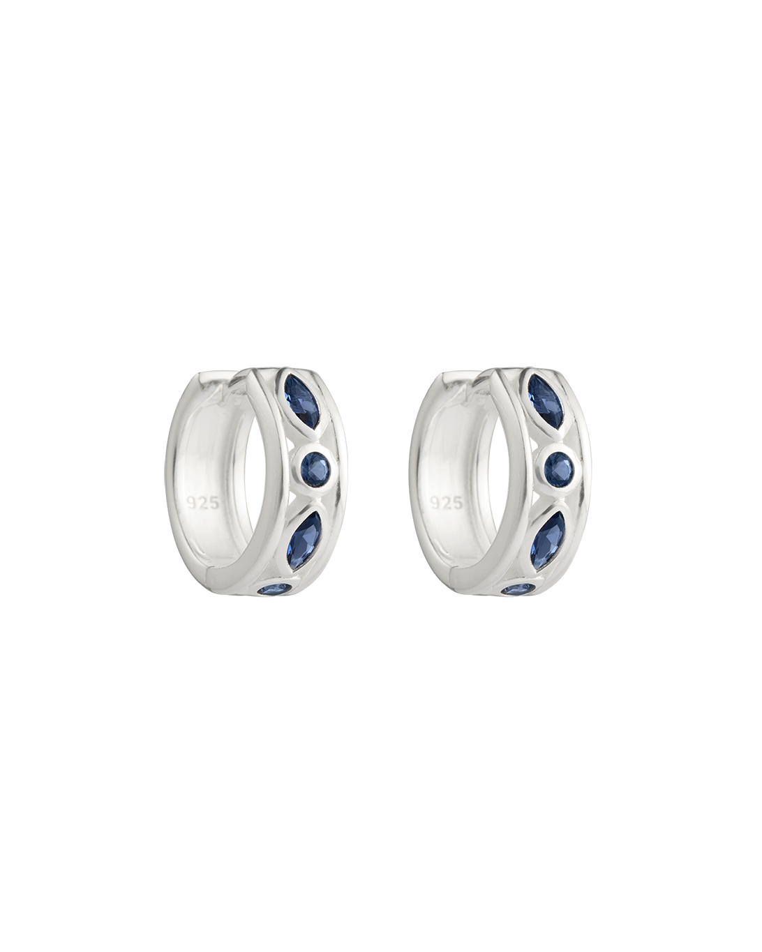 A harmonious blend of vintage inspiration and modern refinement, the Synergy Hoops feature a sequence of marquise and round-cut blue sapphire nano stones. Available in 18k gold plated or silver, this design embodies effortless wearability.