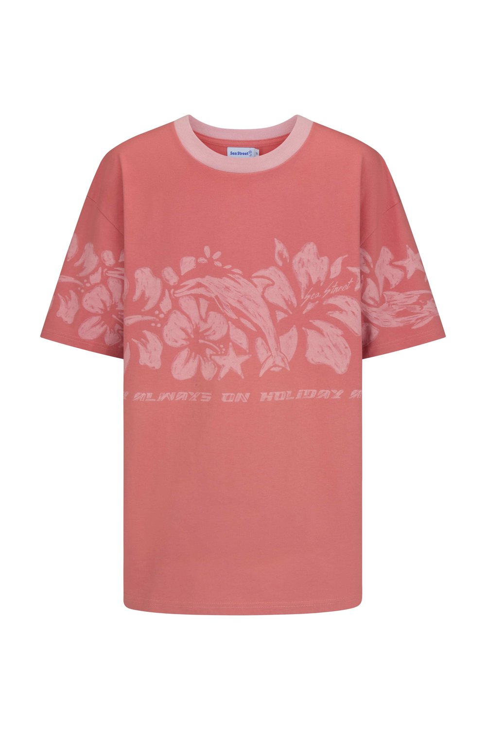 Meet the Troppo Tee — Sun faded, coral red, feels like it’s been laying in the sun all summer. Wrapped in yardage artwork of hibiscus, dolphins, stars, and Sea Street’s “Always On Holiday” spirit, this one’s made for chasing the sun.