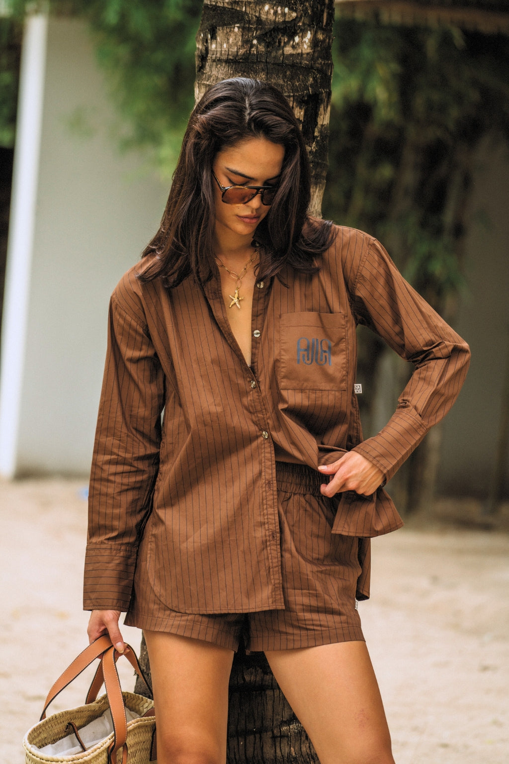 Our best-selling shape in a rich new colour. The AJJA Pocket Shirt in Mocha is made from 100% premium soft cotton, and is an investment-worthy piece for your wardrobe. Featuring a relaxed curved hemline, exaggerated cuffs, buttoned collar and front pocket with AJJA design. Wear with our matching AJJA Stripe Short in Mocha and your fave sneakers for an effortlessly cool everyday look.