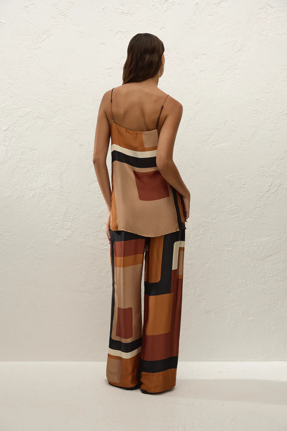 A 90s-inspired slip-style top, designed from a luxurious viscose satin fabrication, in a unique geometric print. Hanging effortlessly off the body in a straight silhouette, it features a straight neckline and thin adjustable straps as well as side seam splits. The hem is finished with a navy blue band. Style over the matching Jensen Pant for an elevated approach to everyday dressing.