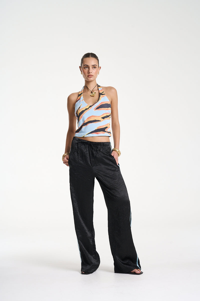 The Boxer Pant in black offer a relaxed fit with a wide leg and drawstring waistband, providing a versatile and comfortable fit. The vibrant blue side stripes elevate this classic style.