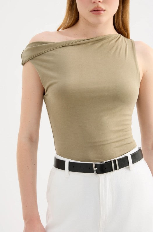 The Chelsea Top is made from a midweight modal fabrication which has a soft, slinky hand feel. The silhouette is a flattering close and finishes at the hips. Features include an asymmetric neckline, with a twist on the off shoulder sleeve.