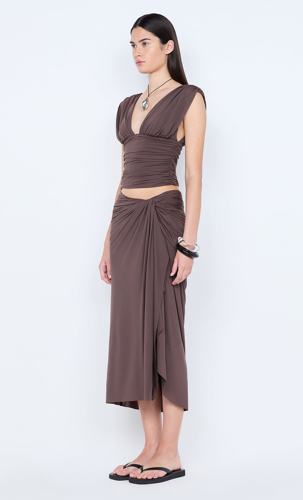 Clementine Gathered Top in Milk Choc. This chic jersey top features a deep V-neckline with a flattering gathered underbust and a fitted waistband, perfect for a night out or elevated holiday styling.
