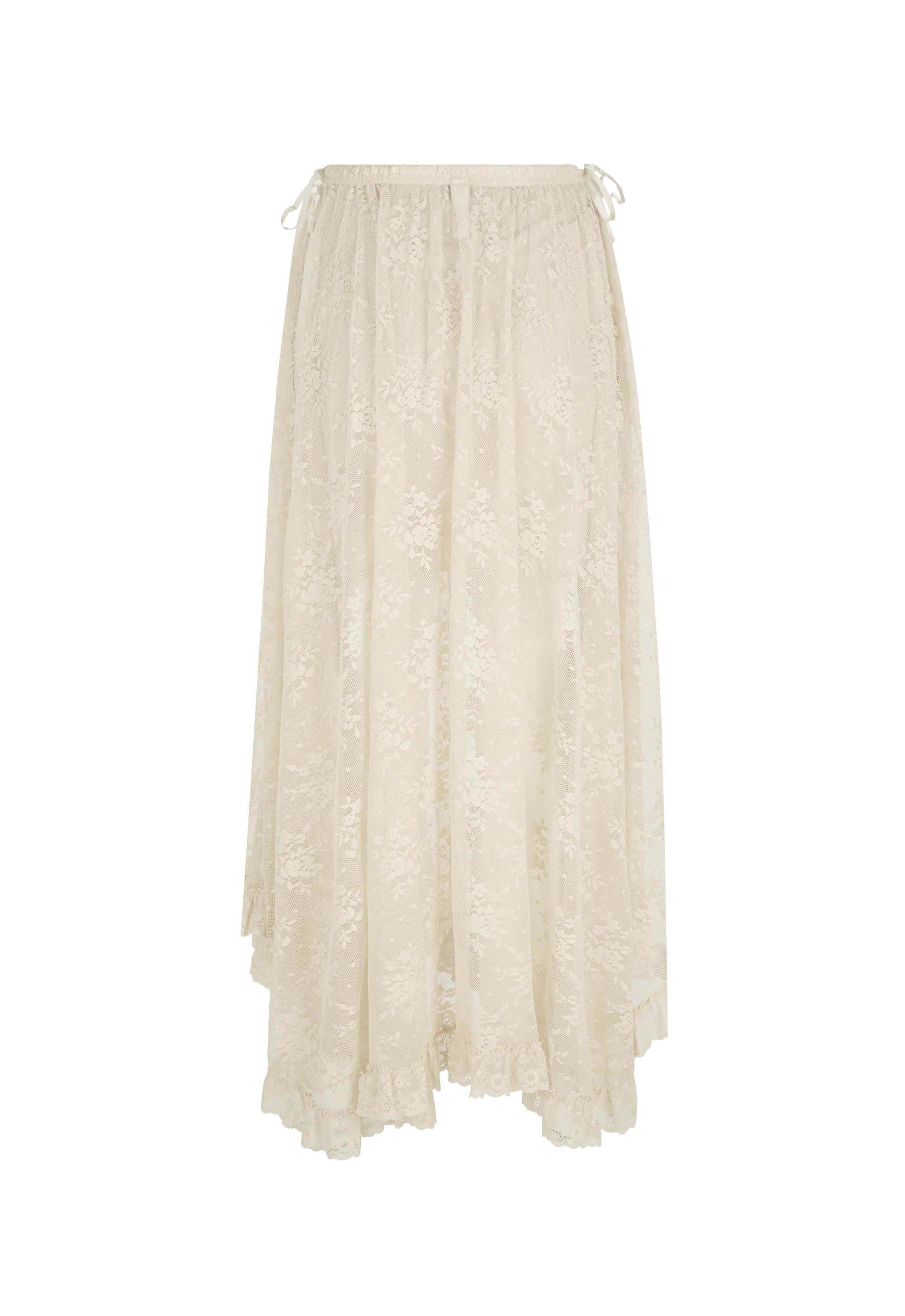 The Labyrinth Lace Maxi Skirt in Cloud Cream is an effortless statement piece that is ethereal and beautiful. Crafted from 90% recycled polyamide with a touch of elastane, this maxi flows with graceful movement while the delicate lace hem trim adds intricate detail. The elastic waist and adjustable side tie offer flattering versatility, whether worn at the waist or hips, while the hi-lo hem creates a playful, dynamic silhouette. Slip lining ensures comfort and confidence with every step.