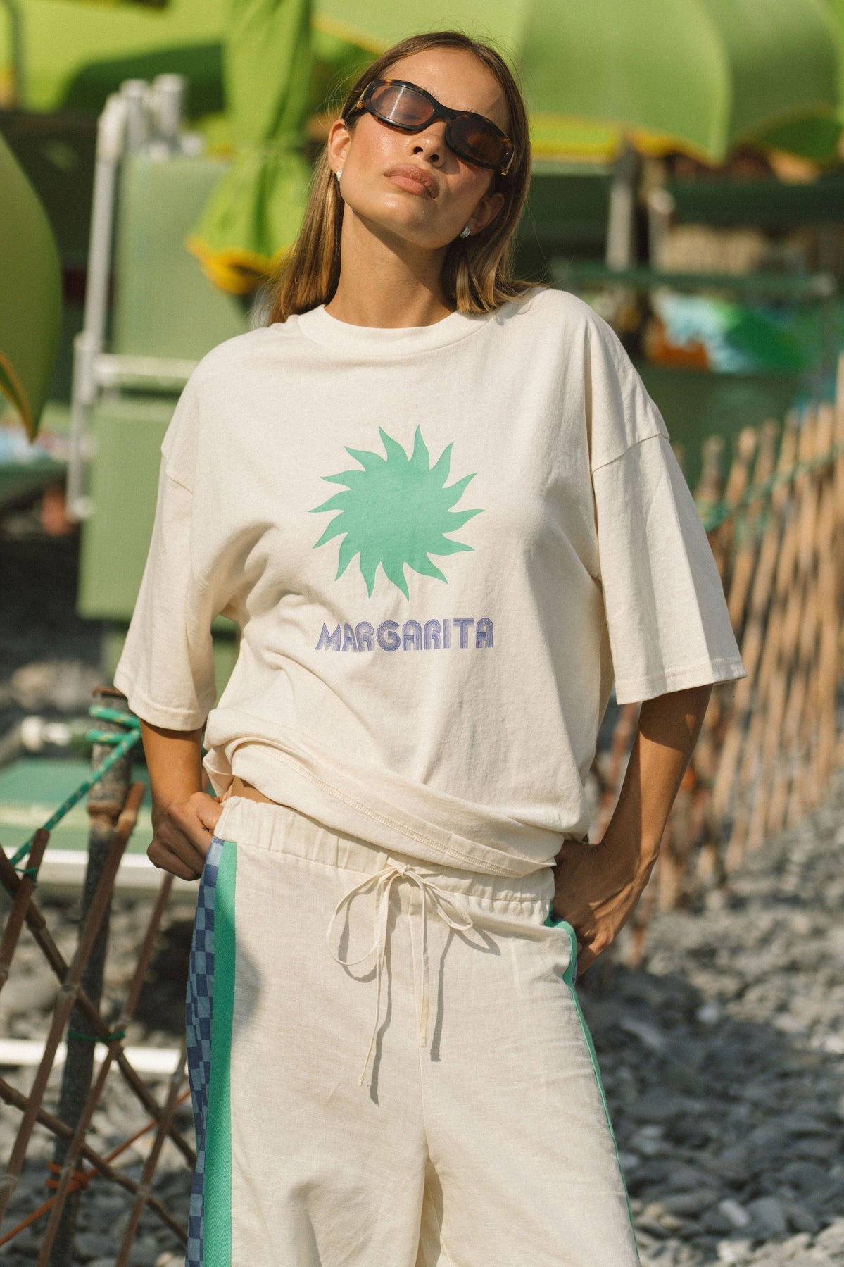 Effortless style with a splash of sunshine, the Margarita Oversized Tee in Natural is made from 100% luxurious soft cotton. Featuring a round neckline and printed graphic on the front.
