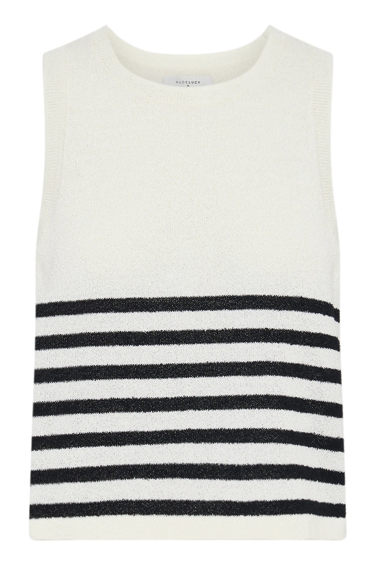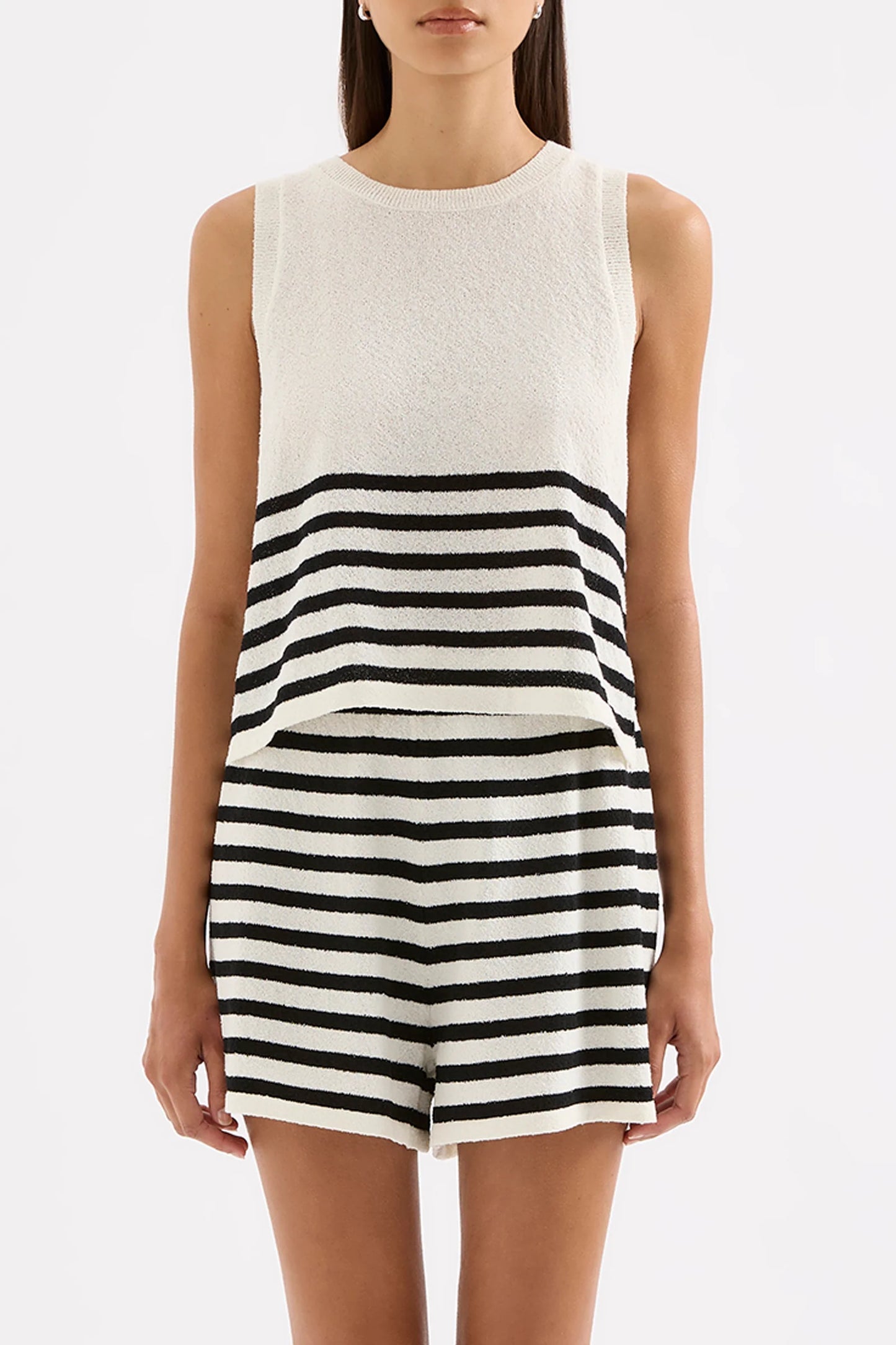 The Marika Knit Tank is a textured knit tank designed with a soft, textured fabrication. It features a classic stripe design in a relaxed silhouette with a narrow crew neckline and side seam slits.