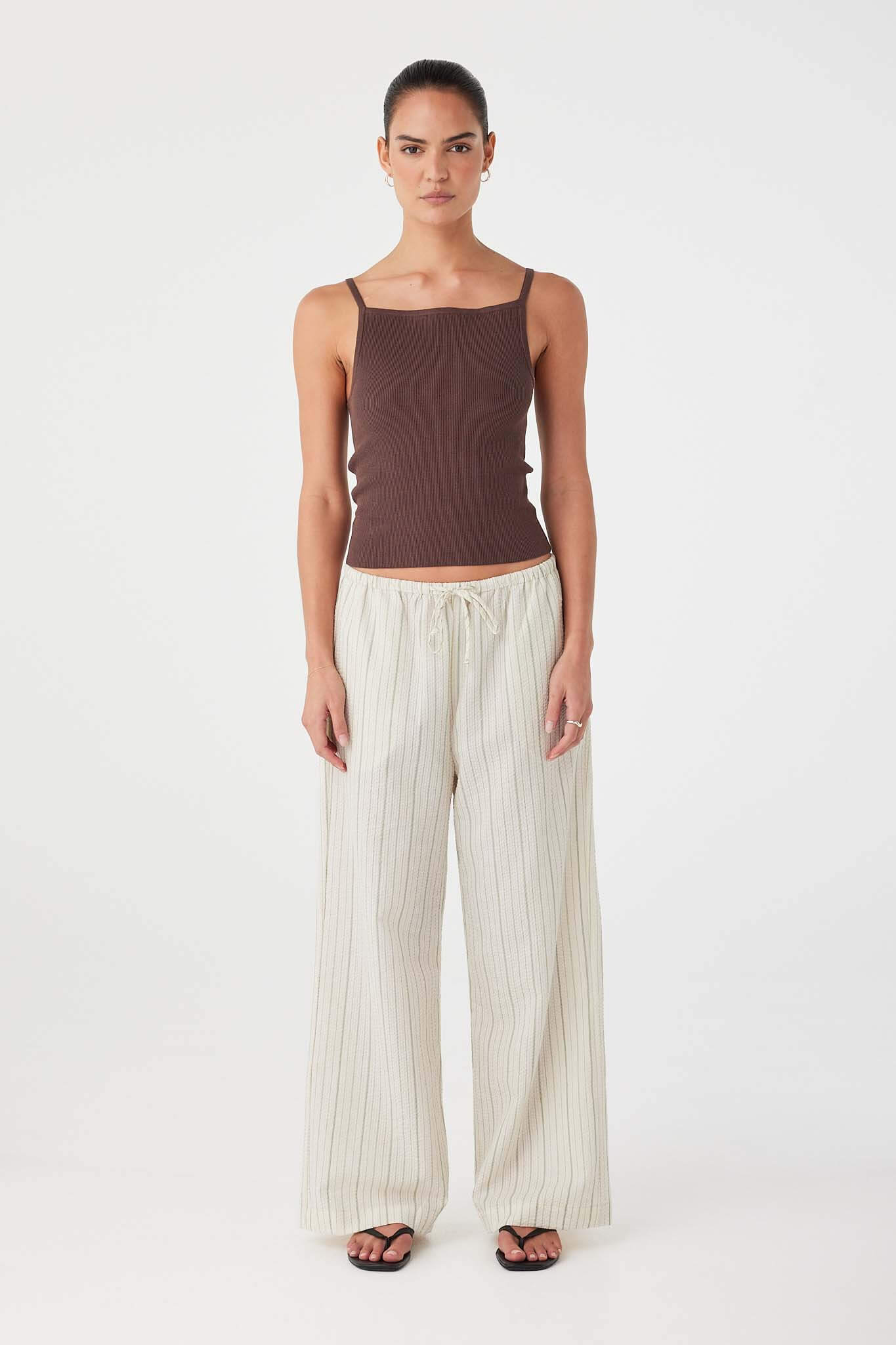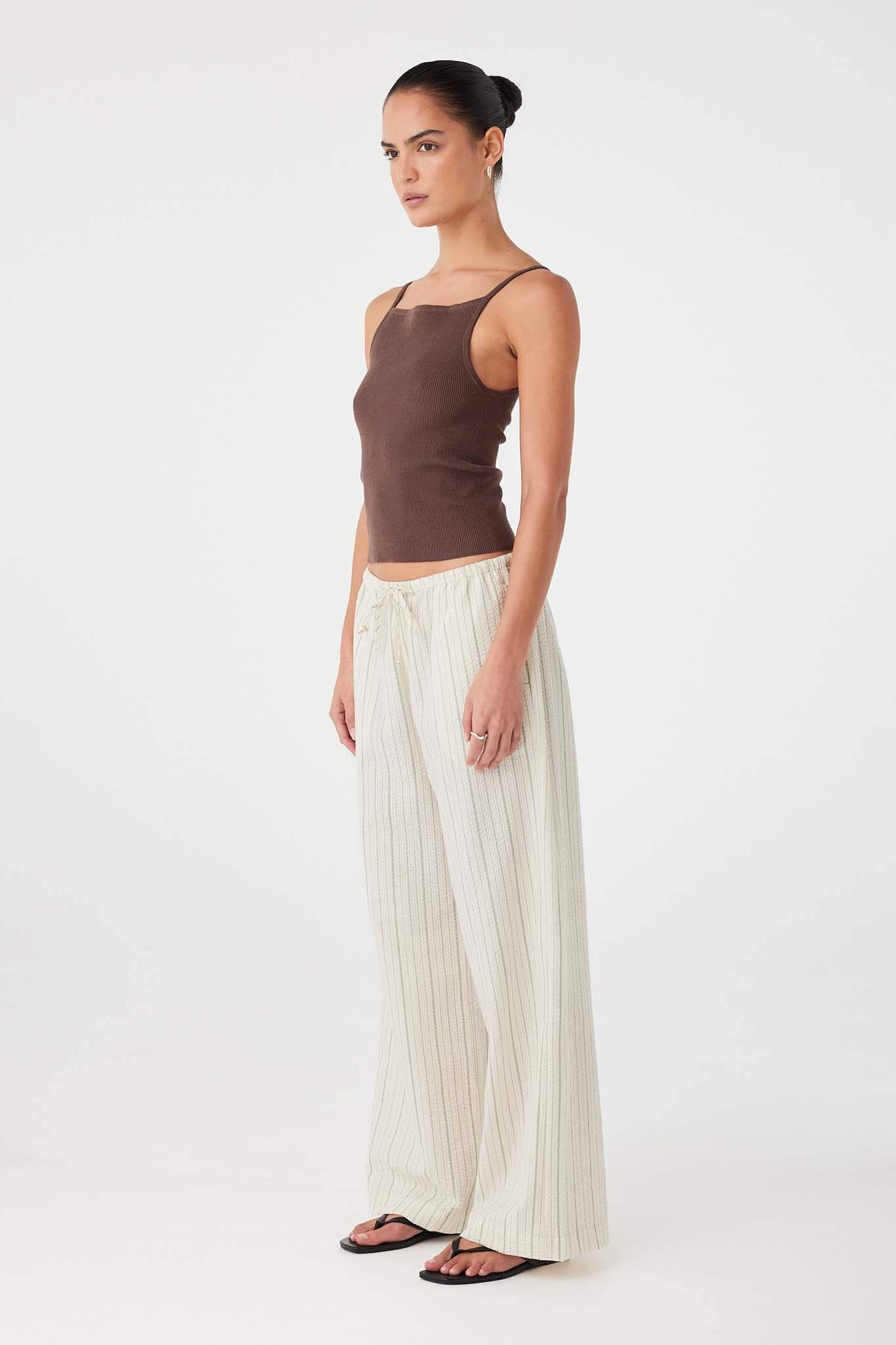 The Sienna Tank in Espresso is a fitted rib knit with a straight square neckline and thin straps for a clean, structured silhouette. Cut from a hemp–organic cotton blend, it offers natural breathability with a soft hand feel, designed for layering or worn alone through warmer days.