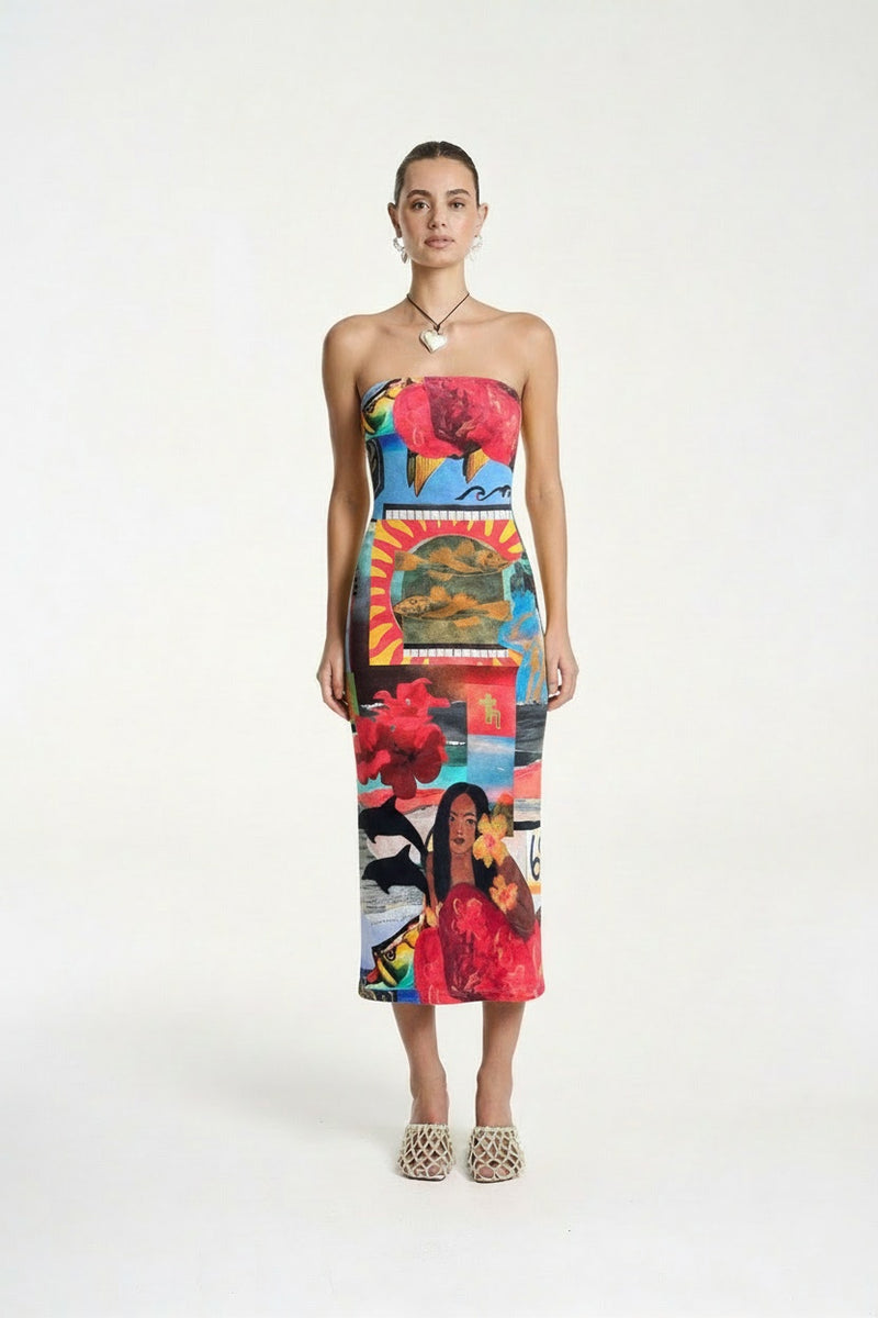 This Strapless Midi dress showcasing the Loco mixed media artwork is made from structured ribbed cotton creating a form-fitting and flattering silhouette.