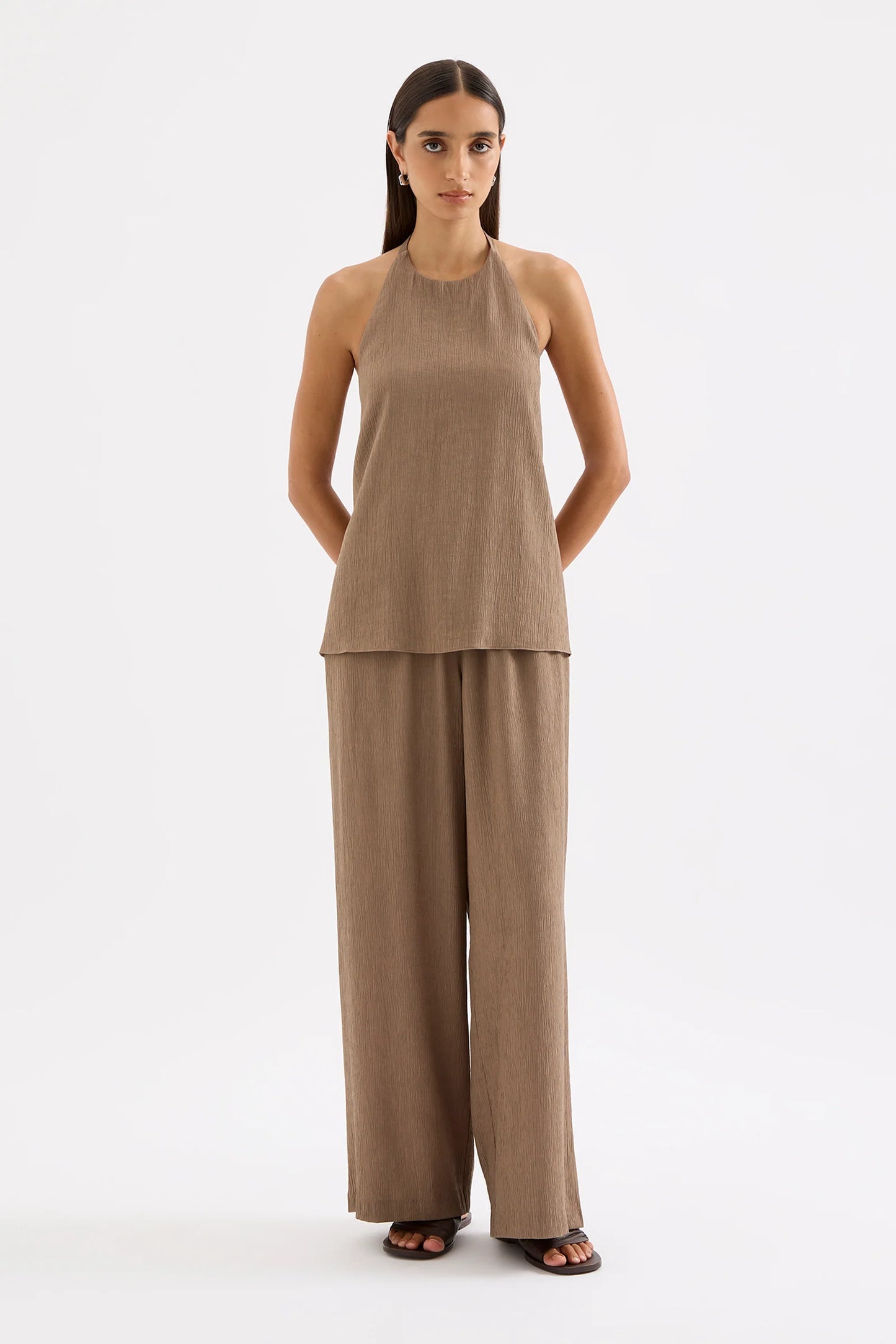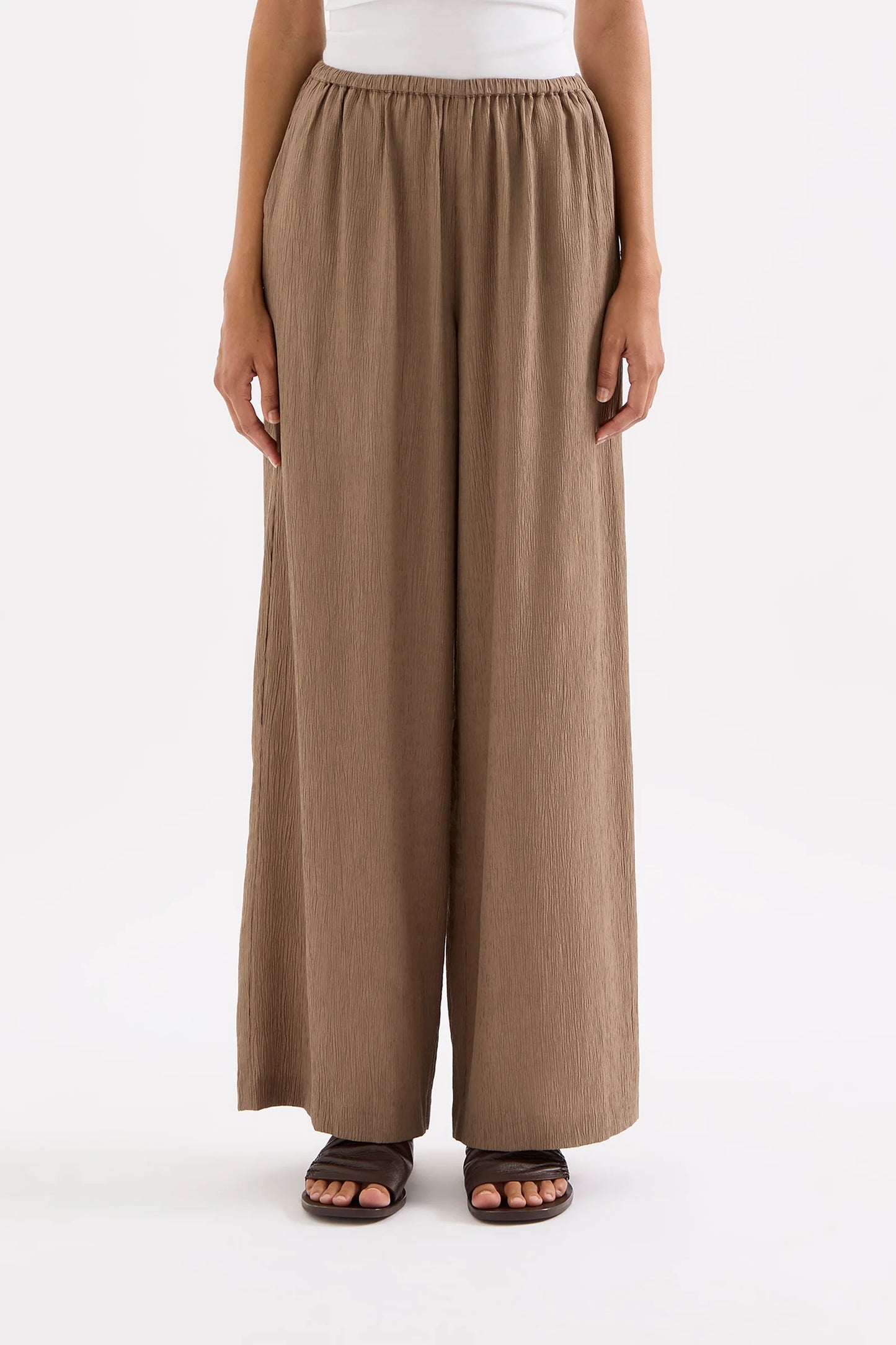 The Winfield Pant is made from a crinkle textured fabric which has a dry, lightweight hand feel. The silhouette is relaxed with a wide full length leg. Features include an elasticated waistband and side seam pockets.